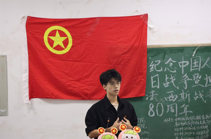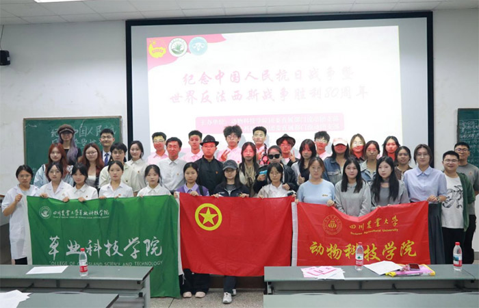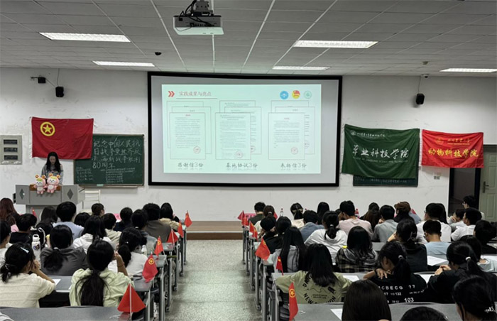 為了深入貫徹學習習近平總書記關于銘記歷史、珍愛和平、開創未來的重要講話精神,進一步引導團員青年傳承紅色基因、厚植家國情懷,10月11日,四川農業大學草業科技學院團委直屬部門流動團支部聯合動物科技學院團委直屬部門流動團支部及四個小班團支部,在成都校區4-A202教室共同舉辦了“紀念中國人民抗日戰爭暨世界反法西斯戰爭勝利80周年”主題示范性班團活動;顒油瑫r面向25級新生,通過邀請草院全體大一新生到場共同學習來深化本次活動引領學習效果并擴大影響力。