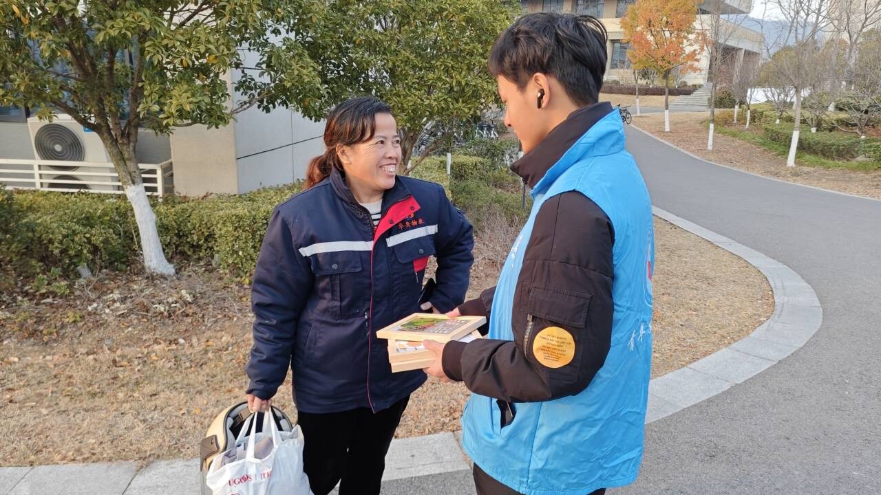 在第二階段,夢溪義工站的義工們帶上掃把、簸箕等工具,來到校園內與清潔工阿姨們一同清掃落葉。他們分工合作,有的清掃道路,有的收集垃圾,有的則將落葉堆成小山,供阿姨們統一處理。在勞動的過程中,同學們深刻體會到了清潔工阿姨們的辛勤付出,也感受到了勞動帶來的快樂與成就感。清掃結束后,同學們將提前準備好的落葉畫送給了清潔工阿姨們,表達了對她們的感謝與敬意。阿姨們收到落葉畫后,臉上露出了欣慰的笑容,紛紛表示感受到了來自義工們的溫暖與關懷。