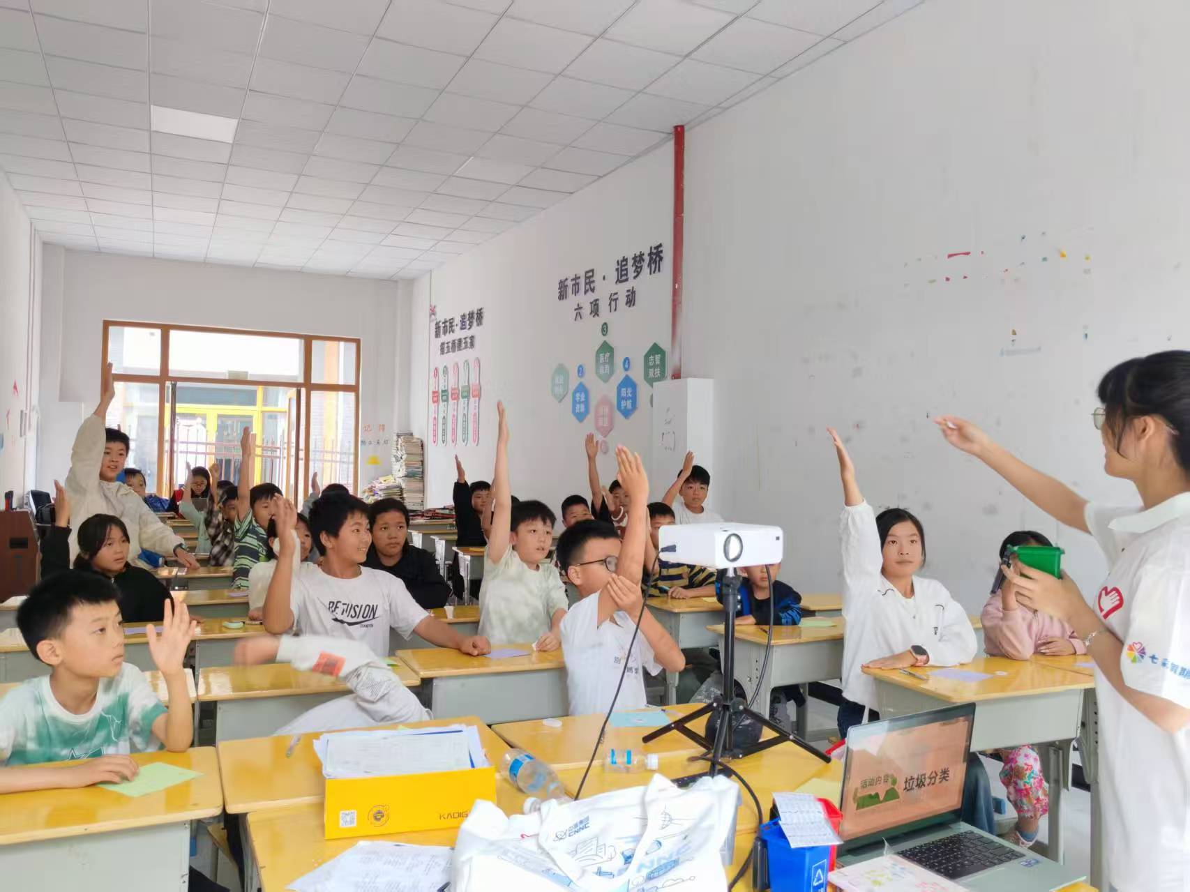 上午,“七彩假期”系列專題課之“美麗家園我行動”開課。支教隊員林芷妍站在講臺上,望著臺下眼神明亮的孩子們,以“我們身邊有哪些自然朋友?又有哪些環境小麻煩?”的提問拉開序幕。話音剛落,孩子們的小手便如雨后春筍般舉起,“有河流、森林!”“塑料袋會污染土地!”稚嫩的聲音此起彼伏,瞬間點燃課堂氛圍。隨后,一段5分鐘的動畫視頻生動演示了廢紙如何變成再生紙、廢塑料如何化身花盆,孩子們瞪大眼睛,不時發出“原來垃圾還能變寶貝”的驚嘆。