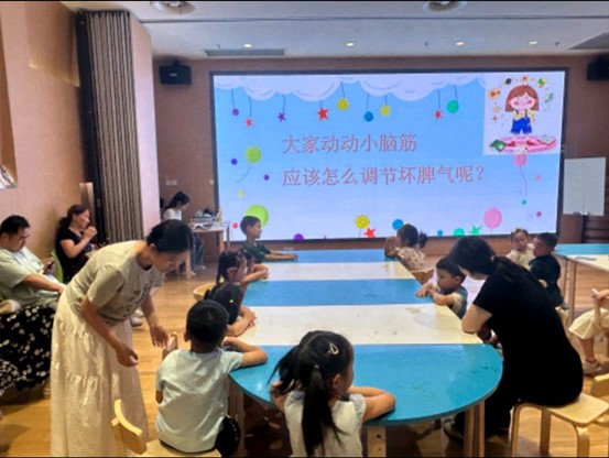 為增強參與感,團隊設置“大家動動腦,調節壞脾氣”互動環節。志愿者走到孩子中間,引導他們結合生活實際思考情緒調節妙招。“我生氣了會深呼吸!”“我會找媽媽抱一抱!”孩子們稚嫩的回答充滿童真,現場氛圍熱烈。