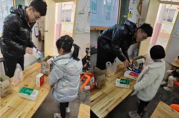 為幫助孩子們消化知識,課堂中設計了游戲環節。王秉銓用四個貼有垃圾分類標識的紙盒模擬垃圾分類桶。每輪游戲先隨機取出生活中常見的一件物品,如橡皮、金屬量角器、紙質包裝盒等。指定一位小朋友將該物品投入對應的紙盒中,以此來模擬生活中將不同類別的垃圾投放進對應的垃圾分類桶的過程。同時,通過獎勵糖果和餅干的方式鼓勵小朋友們積極參與游戲。
