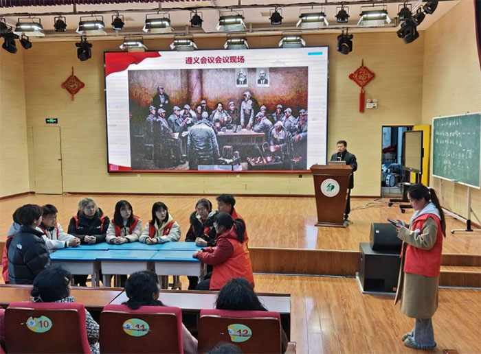 本次宣講從四個方面進行講解:會議的歷史背景,會議的基本過程,會議的偉大意義和會議的精神。開頭首先播放了兩段視頻,一個介紹了遵義會議會址的歷史和傳承的遵義會議精神,另一個生動再現了遵義會議召開前的危急局面,“八萬人打得只剩三萬人,你這是在拿我們的娃娃兵去送死!”生動的畫面讓同學們明白了遵義會議召開的嚴峻的歷史背景,隨后,進行有獎競答環節,有利于在場同學們從淺到深地去了解遵義會議及其精神。同學們積極踴躍舉手,現場氣氛熱烈而活躍。