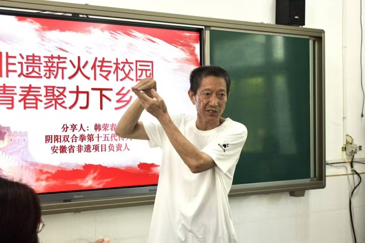 7月4日,合肥大學語言文化與傳媒學院暑期三下鄉社會實踐團隊邀請陰陽雙合拳第六代傳人、安徽省非遺項目負責人韓榮春老先生,于石板沖鄉初級中學開展非遺技藝教學活動與“非遺進校園”分享會,推動中華優秀傳統文化創造性轉化與創新性發展。