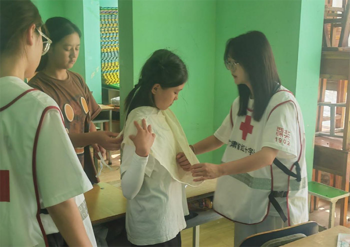 針對青少年常見意外傷害場景,實踐團成員通過“理論+實踐”的模式,采用情景模擬、互動問答等生動形式,向孩子們講解擦傷處理、碰撞傷急救、中暑預防等實用知識。課程摒棄艱澀術語,以情境動畫貫穿始終,依次拆解發燒、擦傷、碰撞傷、流鼻血、中暑幾種暑期高發意外的識別與處置要點。每講一個知識點,志愿者便引導孩子們用“小手勢操”復述關鍵步驟——“一看、二喊、三撥120”,朗朗上口的口訣讓急救流程秒變“順口溜”。在實操環節,隊員們手把手指導小學員們練習環形包扎法、手心傷口8字包扎法、三角巾大懸臂帶包扎法等基礎急救技術,通過分組競賽等方式激發孩子們的學習興趣,以此活動向孩子們傳遞急救知識,提高孩子們對“人人學急救,急救為人人”及紅十字“保護生命與健康”理念的理解。